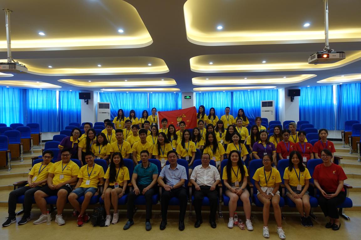 温州市侨办副主任朱玉贵先生为2018年“中国寻根之旅”夏令营“相约温州营”优秀华裔青年商务营授旗,由郑天豪和丁冰冰两位营员共同来接旗。