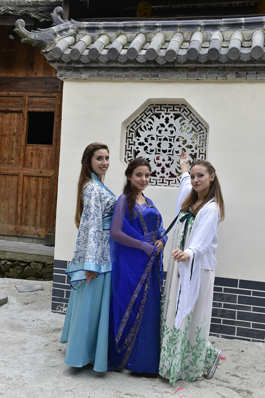 在下石庄村,国际学生流连于溪水延绵的田间地头,徜徉在青山逶迤的古朴村落,领略下石庄村的历史悠久与文化底蕴,感受悠闲自得的村民生活方式,品尝当地特色传统美食。在文成县博物馆,一场由国际学生与文成县学生共同演绎的汉服文化体验活动悄然来临。来自文成县的学生以一曲古筝演奏开启活动序幕,悠扬婉转的琴声让观众感受到传统文化的魅力。来自温州大学的国际学生随即表演了汉服秀,让观众领领略到汉服礼仪的端庄与典雅。傅玲丹向现场观众介绍了汉服的基本礼仪、操作流程和文化内涵,给观众上了一堂生动的礼仪课。周紫宸带来中国古典舞《咏荷》,她的舞姿优美,身影流动,随着乐曲缓缓舒展,让人如痴如醉。包容小朋友的古琴独奏《酒狂》高低起伏,错落有致,寓意深刻。国际学生还表演了美轮美奂的旗袍秀,赢得现场观众的阵阵掌声。文成县学生的茶道表演也让国际学生第一次近距离感受中国人沏茶、赏茶、闻茶、饮茶的茶文化礼仪,品赏茶的美感,感受中国人以茶修身的生活方式。此外,由我校国际学生十佳歌舞大赛获奖者带来的表演也将现场气氛推向高潮,他们的舞蹈时而奔放时而婉约,歌曲时而高亢时而低沉,给观众带来一场精彩的视听盛宴。意大利的交换生LIVRANO MARIANA说,“今天我穿的旗袍非常漂亮,我想买一件作为纪念。我期待下一次再来文成领略这里的传统文化和自然风光。”