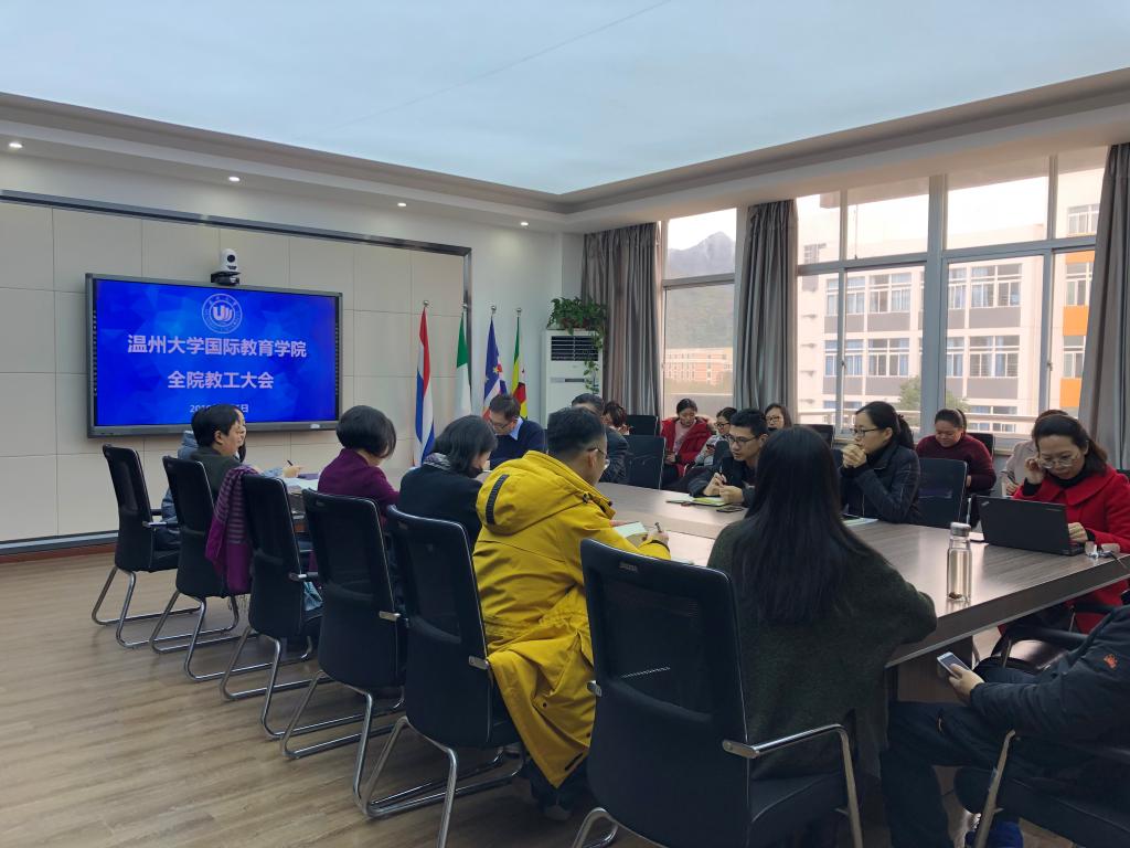 副书记陈文远宣读了2018年获得学校各类优秀荣誉的教师及团队名单,如:温州大学先进工会集体、“温州大学优秀教师”金碧、“温州大学优秀辅导员”谢坚等,通报了上学期中外学生各班级奖惩情况和寒假期间留学生公寓走访情况。陈文远还部署了新学期学生工作,指出要树立跨文化管理思维,规范学生学业标准,加强学生教育管理,坚持“教无定法,贵在得法”,形成“齐抓共管”局面。