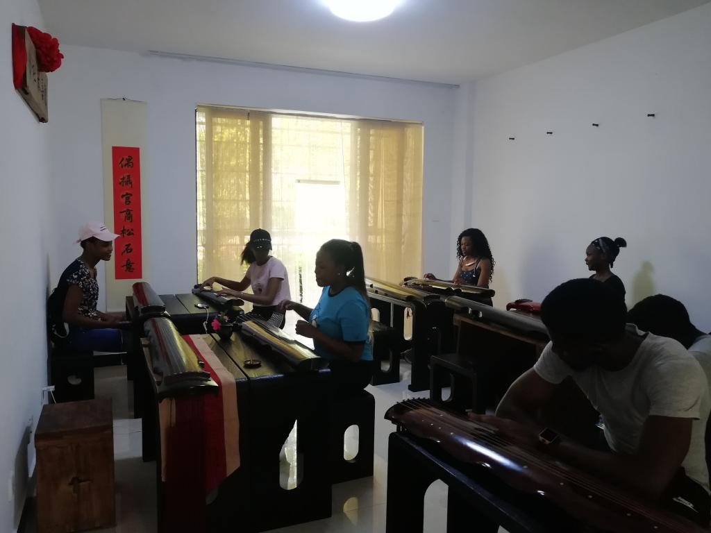 学生们按捺住激动的心,听蔡老师讲解了古琴的基本指法和演奏技巧。随后,蔡老师手把手教学生练习经典曲目《沧海一声笑》,一时间,琴声潺潺,余音悠远,此起彼伏的琴音似乎把人带到了遥远的时空。在多次尝试与反复练习后,大多数学生迅速掌握了古琴的基本指法,有两位加纳的女生还能非常流畅地弹奏了该曲目,博得同学们的阵阵掌声。