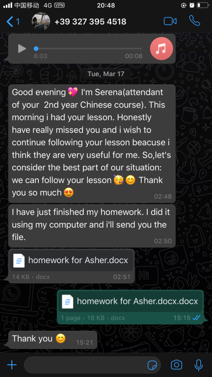 张珉璐老师于2019年1月-2020年1月外派到温州大学意大利分校进行汉语教学工作。今年1月外派结束返温后,张珉璐老师应分校学生的强烈要求,继续为学生开展线上课程。每周都为每个年级精心录制长达两个小时的教学视频,录完后再把这些视频还有音频、ppt、课后练习及一些额外针对不同级别的HSK练习发送给意大利老师,再由意大利老师上传至锡耶纳大学的学习平台,学生通过平台下载视频和学习资料进行学习。