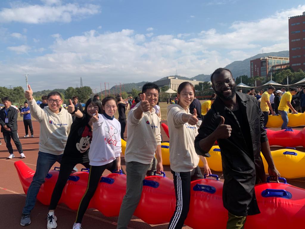 的外教们也积极报名参加了运动会比赛项目,他们和中国老师们一起跳绳、一起参加毛毛虫竞速比赛,展现了浓浓的“国际范儿”,也体现了中外老师团结合作的团队精神,来自加纳的外教ADOFO MICHAEL ADJEI更是在教工甲组男子100米决赛中获得第一名的好成绩。