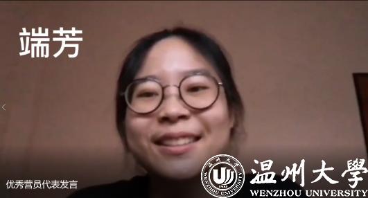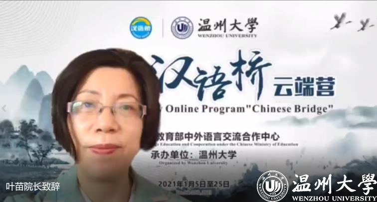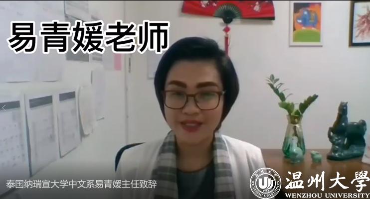 泰国纳瑞宣大学中文系易青媛主任致辞。她很感激温州大学“汉语桥”云端营在疫情期间为纳瑞宣大学的同学们开设了丰富的语言文化课程,给同学们提供了很多学习中文的机会,感谢所有兢兢业业上课的老师们。新春在即,她遥祝各位领导和老师新年快乐,牛年大吉大利,同时表达了中泰两校合作的美好期待。