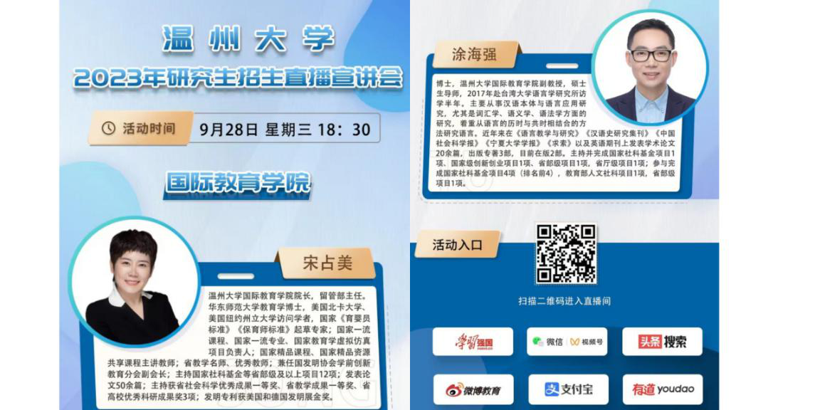 的师资力量、发展历史、组织结构进行了全面的论说,并讲述了报考温大汉语国际教育硕士的5大理由:1.具有全球竞争力的国际化人才2.资源共享,助推全球胜任力3.国际化教师团队,打造国际化氛围4.与国际生做同学,提高英语能力和拓宽国际视野5.可获得全球就业机会,提高考编考公通过率。