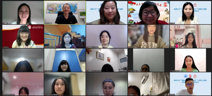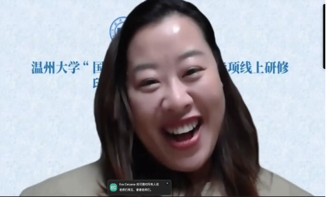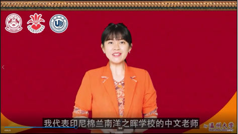 张珉璐老师介绍了印尼学生的整体学习情况,并热切期盼未来印尼学生能来到温州大学的校园,和老师、同学面对面交流,实地了解和体验中国语言文化。张珉璐老师还播放了此次线上研修班总结视频,以此鼓励印尼学生来温州大学留学,圆“汉语梦”。印尼棉兰南洋之晖学校叶贤智老师对温大教师对学员们的耐心教导与悉心辅导给予诚挚感谢,表示学生们学习热情高涨,汉语水平也得到了一定提升。