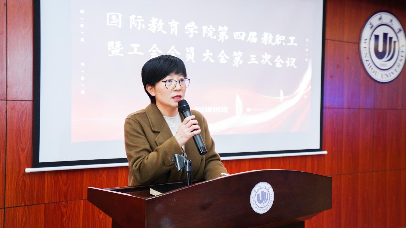 在国际楼203报告厅召开第四届教职工暨工会会员大会第三次会议。会议由学院党总支书记林爱菊主持,全院教职工参加会议。