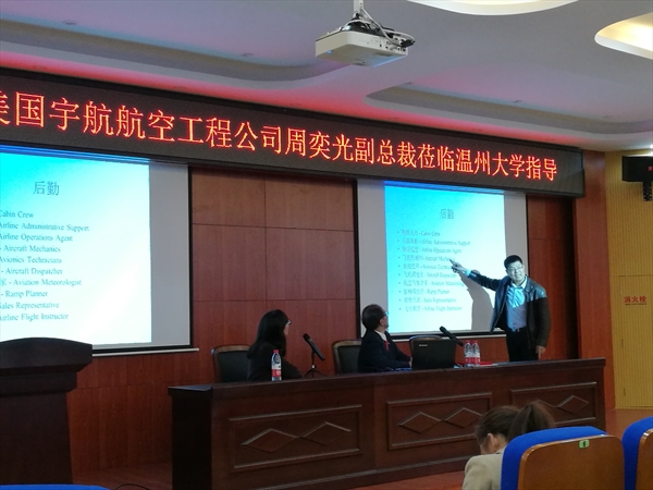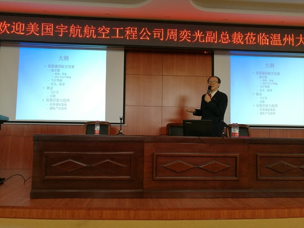 副院长、温州市通用航空飞行学院(筹)常务副院长包含丽主持。航空管理教研室全体教师、2016级与2017级航空管理专业班的69位同学、通用航空爱好者及中国民航飞行学院王永虎教授参与该活动(相片1)。周副总裁在题为《美国通用航空产业发展现状与趋势》的主旨演讲中以美国通用航空发展为借鉴,介绍通用航空器种类、各种类用途、设计与生产制造、飞行驾驶维修、航管与安检证照等内容,以及航空领域就业情况和美国航空产业发展经验与趋势等。