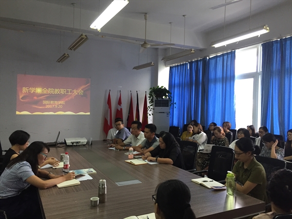 会上,院长兼书记叶苗向全体教职工解读了习近平总书记“7.26”重要讲话精神,传达了全国、全省思想政治工作会议以及2017年暑期党委理论学习中心组(扩大)学习会议精神。她代表学院欢迎新入职教工,并总结了近半年来学院整体工作情况。上学期,学院各项工作在相关科室负责人带领下齐头并进、全面开花:学院办公室、教学科、学生科、学科教研室等部门上下拧成一股绳,助力航空管理专业和留学生教育实现人才引进、招生数量、生源质量“三飞跃”;汉语国际教育推广教研室团队成功举办国侨办“寻根之旅”华裔青年夏令营及海外华文教师证书培训班,成效斐然。