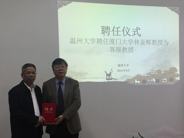 中外合作办学工作表示肯定,并强调国际化是温州大学的重要发展战略,作为温州大学国际化发展的中坚力量的国际合作学院要继续发挥排头兵的作用。最后,举行了聘任仪式,李校堃亲自为林金辉教授颁发温州大学客座教授证书,正式聘请林金辉指导温州大学的中外合作办学,加快实现温州大学的国际化大发展。