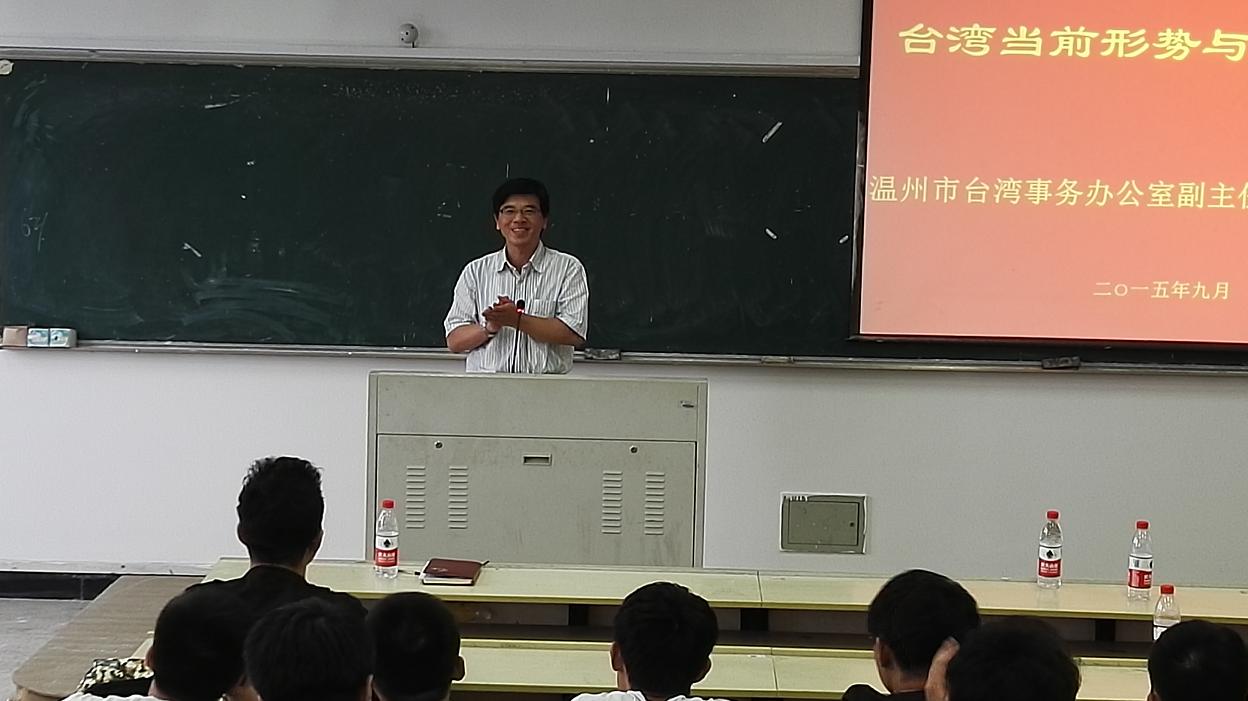张振宇副主任为全体同学和老师作了“台湾当前形势与政策解读”的报告,他详细介绍了温州市台办对全体同学赴台学习交流的具体要求,并结合台湾地区当前的环境形势和风俗习惯,对如何融入当地学习和生活做了适应性的通识教育,鼓励各位同学要有较好的自律自强能力,主动有效地完成在台湾的各项学习任务,收获不一样的人生体验和学业成果。