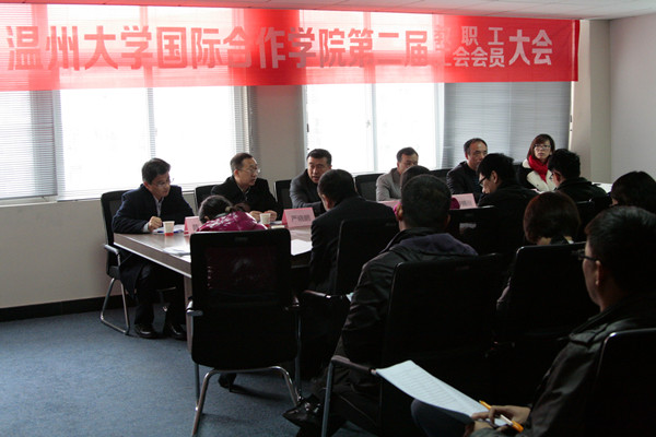 2013年12月11日下午,温州大学国际合作学院第二届教职工暨工会会员大会在专家楼304会议室隆重举行。温州大学副校长薛伟、校工会常务副主席钟锦川到会祝贺。